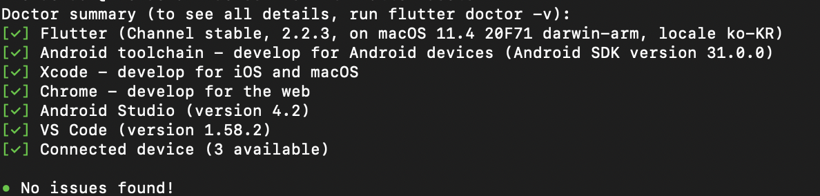 7. flutter doctor 실행해서 점검.