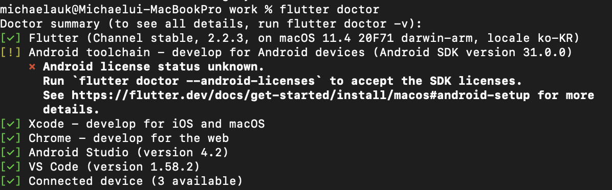 3. flutter doctor 실행.