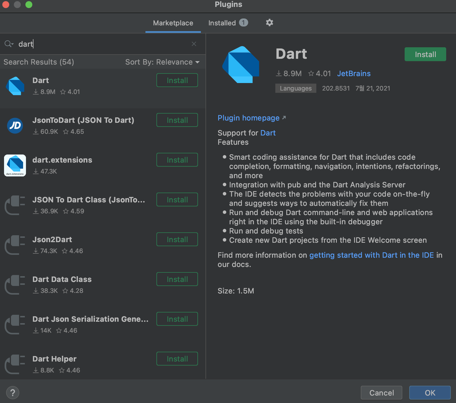 안드스튜디오 실행 -> 우하단 톱니모양 클릭 -> Plugin 선택 -> Dart 검색 -> install