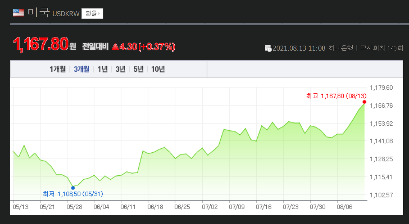 그래서 한국 원화 환율은 상승세이고..