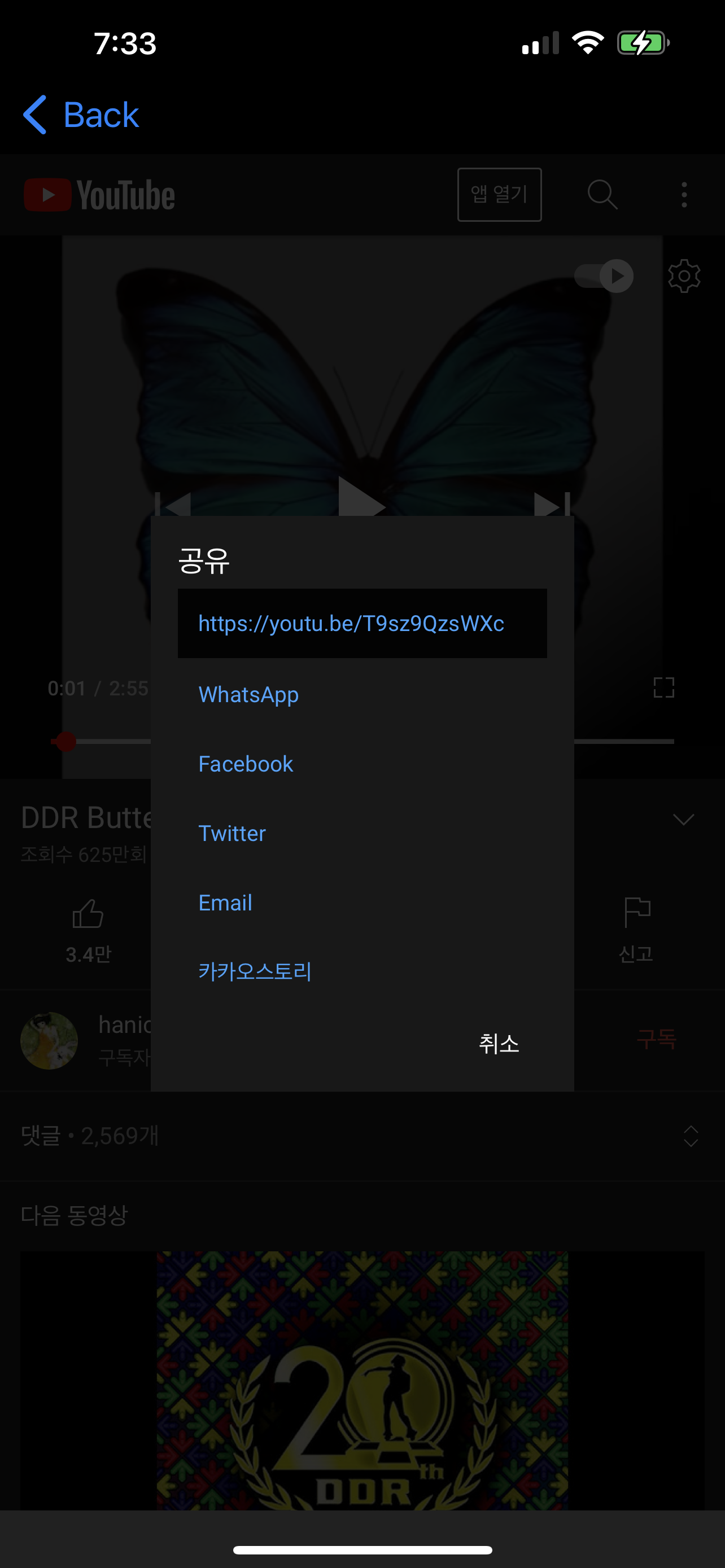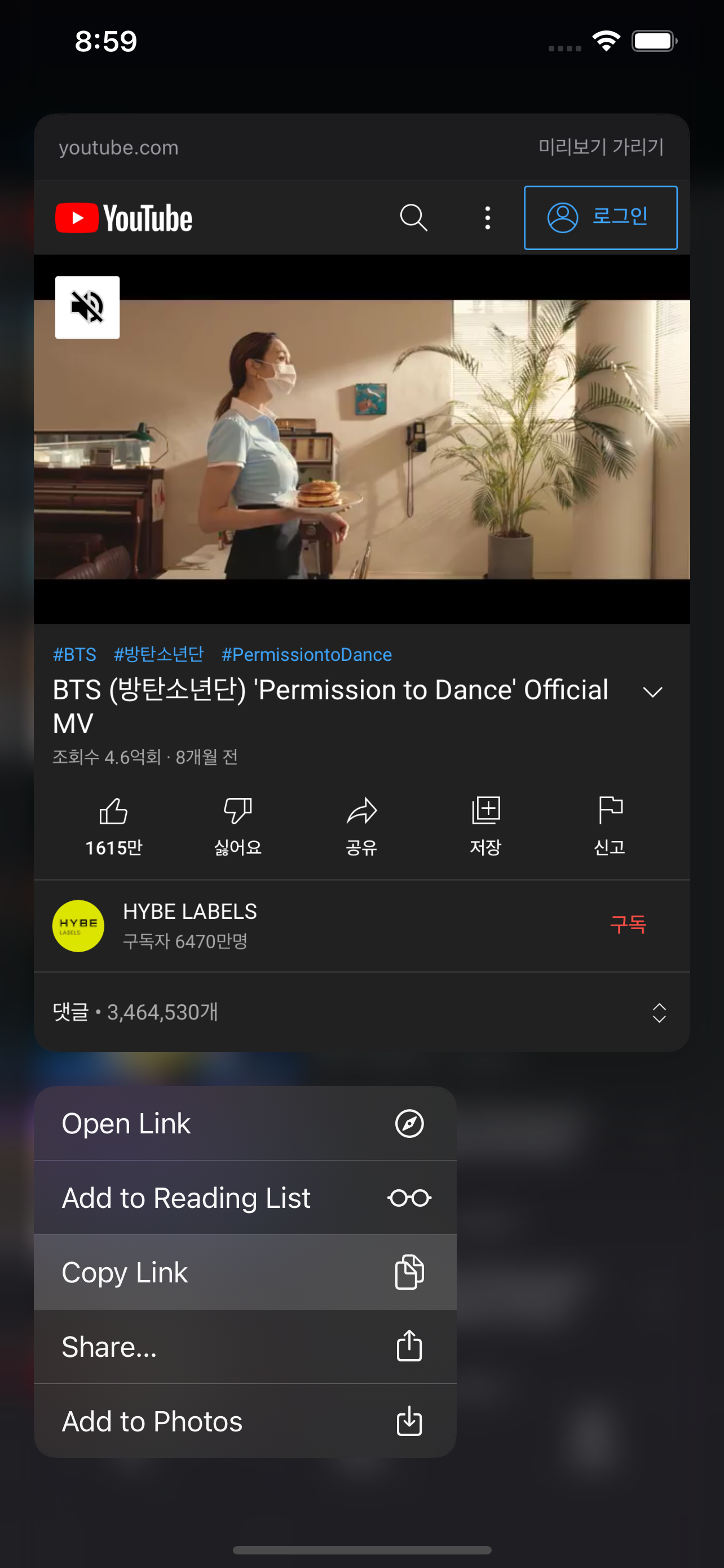 2. 원하는 영상이 나오면 롱터치를 해서 링크를 복사합니다.