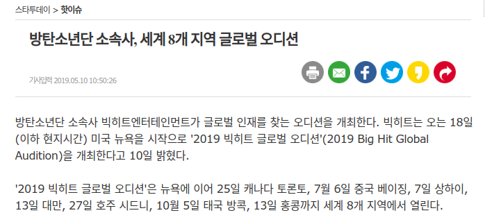 방탄소년단 소속사, 세계 8개 지역 글로벌 오디션 - 스타투데이