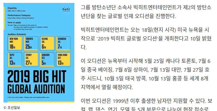 1. 빅히트 BTS 후속 발굴작업위해서 오디션 진행예정입니다.