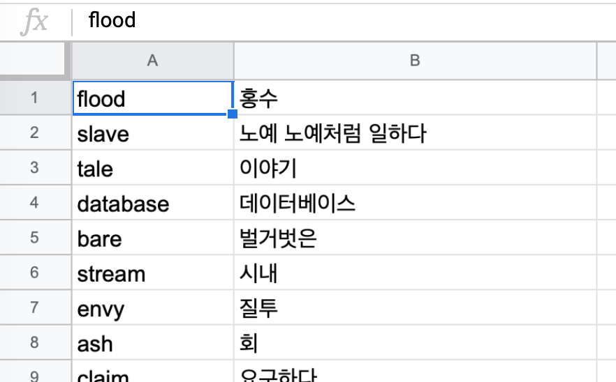 2) 아래 그림처럼 반드시 A열에 영단어, B열에 한글 뜻을 쭉 저장합니다.