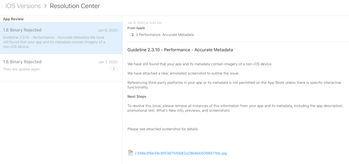 "We have still found that your app and its metadata contain imagery of a non-iOS device."