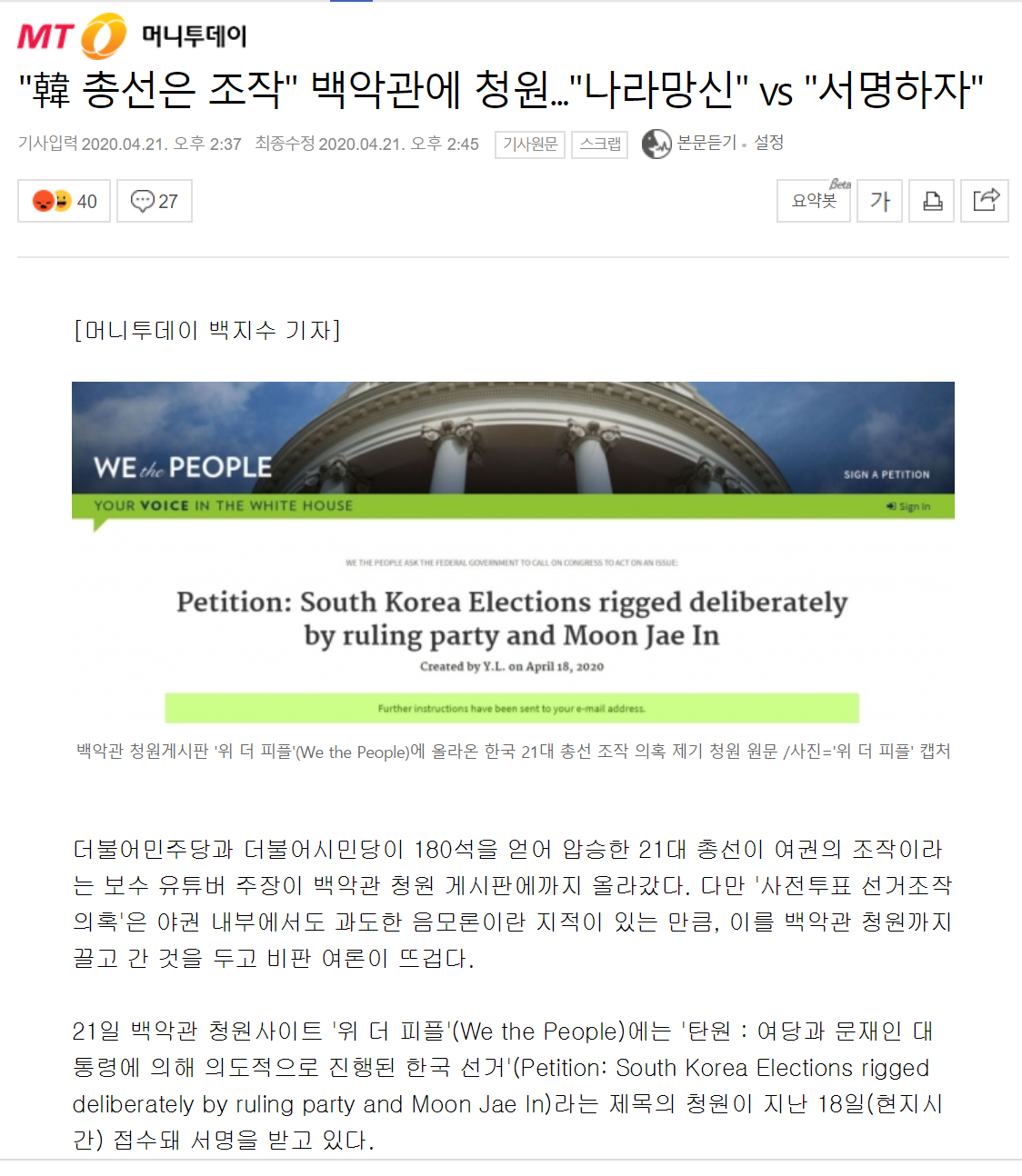 "韓 총선은 조작" 백악관에 청원..."나라망신" vs "서명하자"
