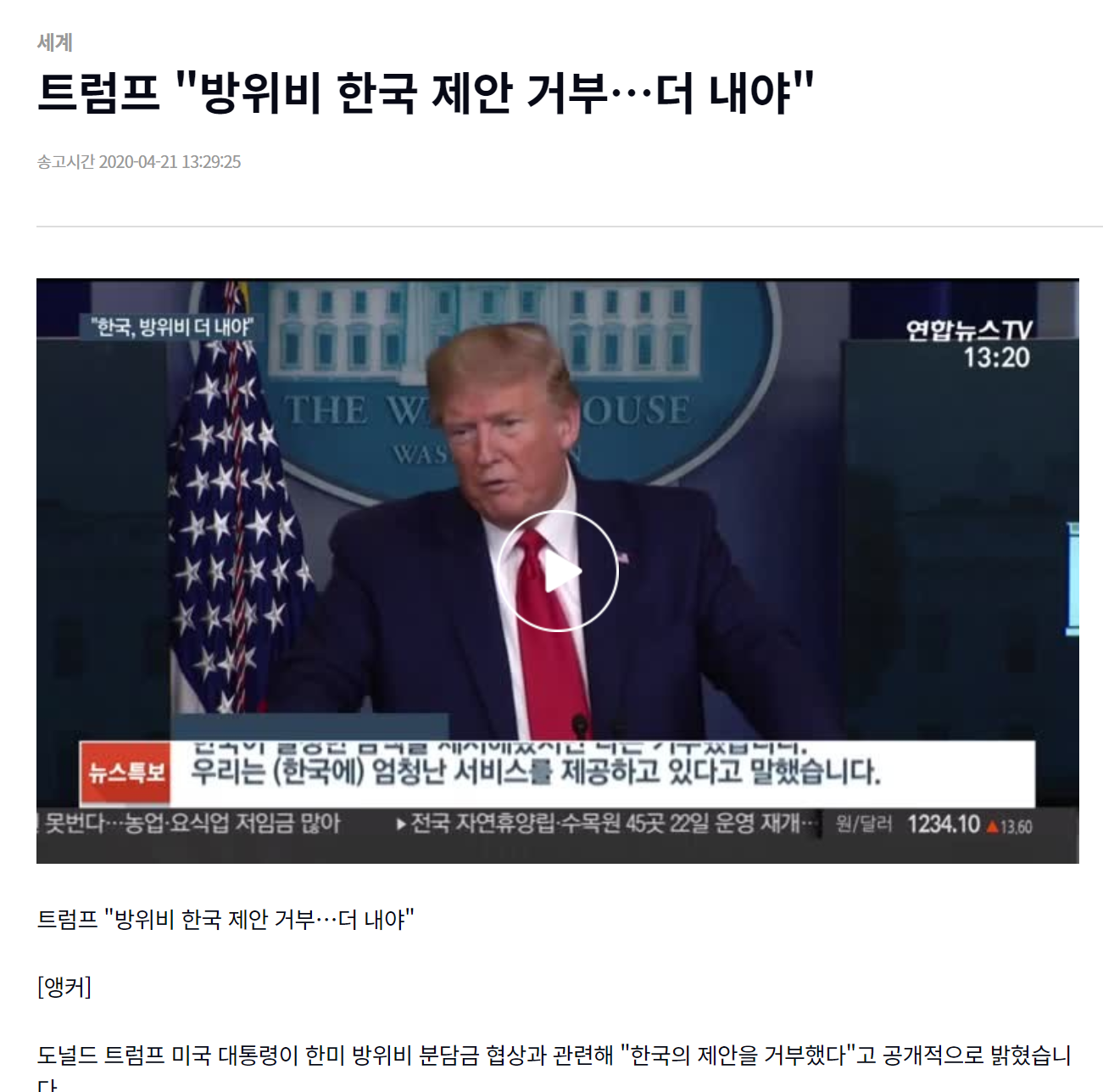 미군데려다 쓰는게 가성비가 최고임. 사실 미국이 저렇게 주장하는 방위비가 천문학저인 내용은 아니나, 트럼프가 접근한는 방식이 국민들의 귀를 거슬리게 하는것은 맞음.